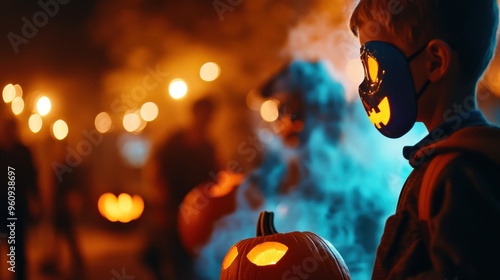 Naklejka premium A child celebrates Halloween, holding a glowing pumpkin, surrounded by a festive atmosphere filled with smoke and lights.
