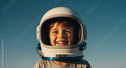 © benjamin, Obraz premium A child dreaming of space exploration, wearing an astronaut helmet, with the clear blue sky as the background