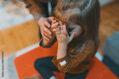 © Milos, Fototapeta premium A child holds a smartphone, showing curiosity and playfulness in exploring modern technology within a familiar setting, highlighting engagement and discovery.