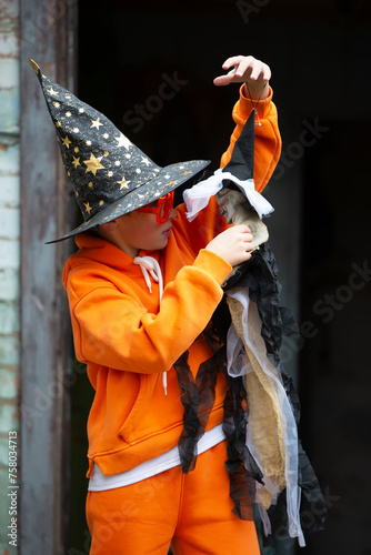 Fototapeta premium A child in an orange costume and a wizard hat for Halloween. A boy holds a...