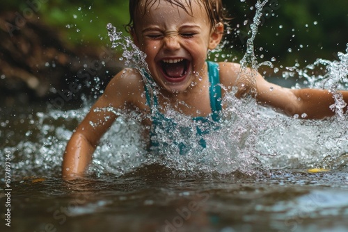 Fototapeta premium A child plays in a shallow river, laughing and splashing water joyfully. Sunlight filters through the trees, creating a cheerful atmosphere. The moment captures pure happiness and childhood delight