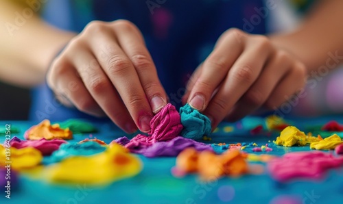 Fototapeta premium A child's hands creatively shape vibrant modeling clay into various forms on...