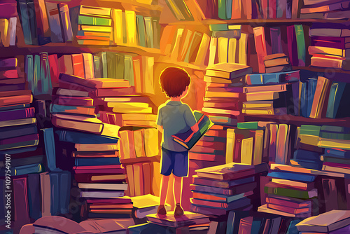 Obraz premium A child stands among colorful books, exploring a magical library filled with...