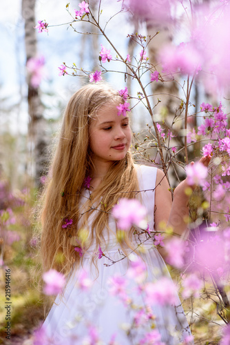 Fototapeta premium A child stands among the ledum and birch in white dress, smiling and fly hair