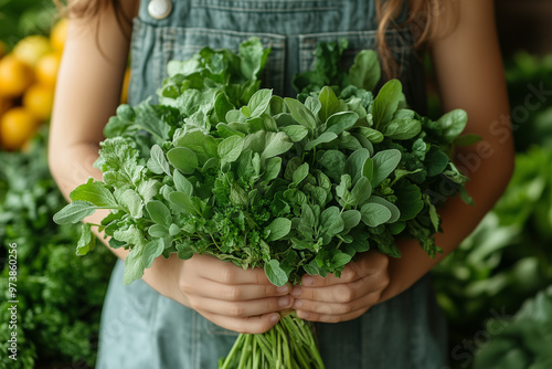 © Daria, Fototapeta premium A child surprising their mother with a bouquet of fragrant herbs and foliage from the garden, their earthy scent a reminder of the beauty of nature.