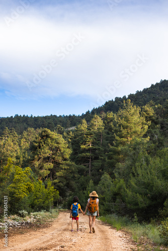 Obraz premium A child with mom walks along a forest path