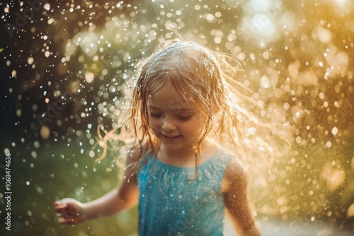 Fototapeta premium A child with wet, flowing hair laughs and twirls as she splashes through water droplets on a warm evening, illuminated by soft sunlight