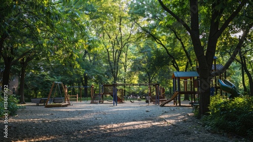 © Vikarest, Obraz premium A children's playground with swings and slides surrounded by trees,