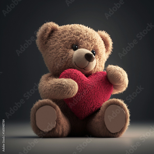Obraz premium A children's toy fluffy Teddy bear holds a red heart in its paws. Generative...