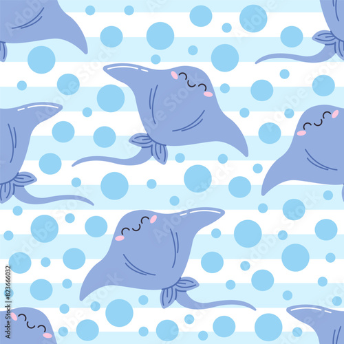 © lovaisme, Naklejka premium A children's vector seamless pattern with a cute sea stingray and bubbles on a background of blue stripes. Ideal for baby bedding, wallpaper, wrapping paper, fabric, textiles, T-shirt prints