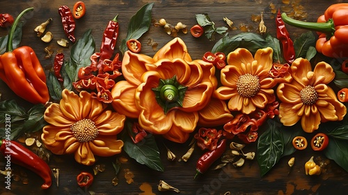 © rana, Naklejka premium A chili food art piece with peppers carved into intricate floral shapes