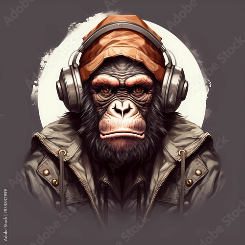 © Gerges, Fototapeta premium A chill gorilla wearing headphones and a brown hat against a circular light backdrop