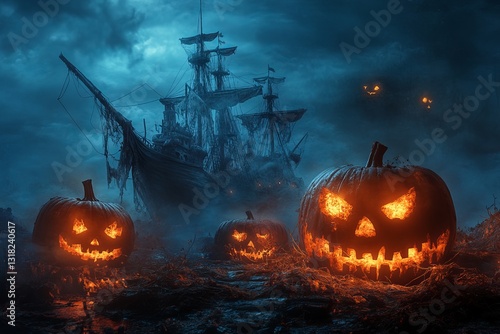 © Cloudyew, Fototapeta premium A chilling Halloween scene featuring glowing jack-o'-lanterns in the foreground and a ghostly pirate ship sailing through an eerie fog, creating a haunting atmosphere.
