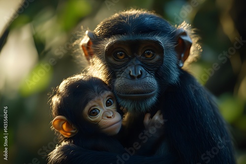Fototapeta premium A chimpanzee mother lovingly embraces her baby in a close up shot with a...
