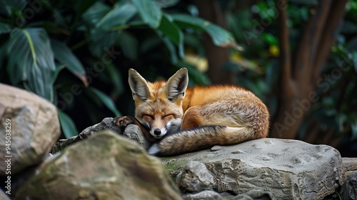 © NASIR, Obraz premium A chin fox resting on a heap of rocks in a rainforest