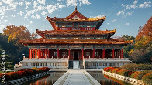 Naklejka premium a Chinese building with red pillars and a white blue sky background