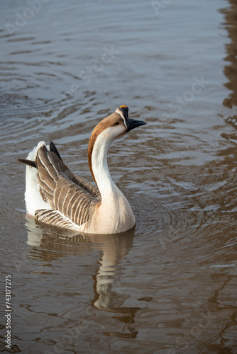 Fototapeta premium A Chinese Goose swimming in Sikes Lake in Texas
