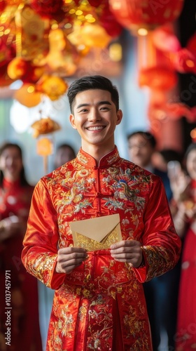 Fototapeta premium A Chinese man in traditional attire smiling at Chinese new year celebration while holding a red envelope, representing cultural pride and tradition.