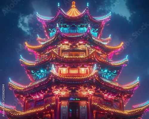 Naklejka premium a Chinese pagoda illuminated at night with colorful lights outlining its elegant features, creating a magical