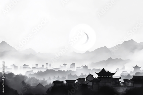 Fototapeta premium a chinese-style ink painting background with the sun rising over tradition