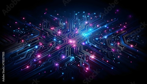 Fototapeta premium A chip circuit board with purple, blue, and green bokeh shows how the circuit...