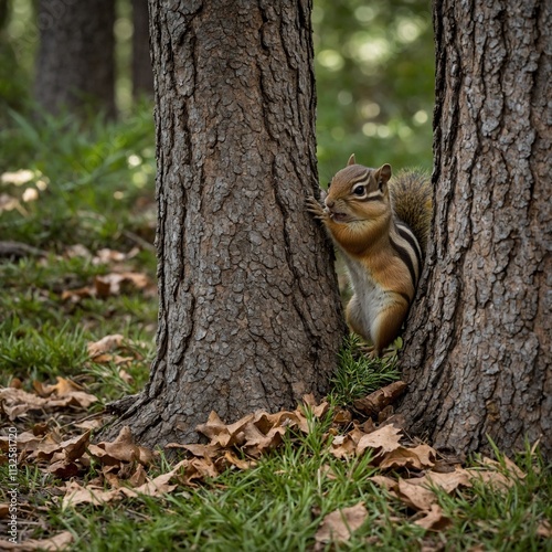 © Kashif, Fototapeta premium A chipmunk gathering acorns beneath towering pine trees.