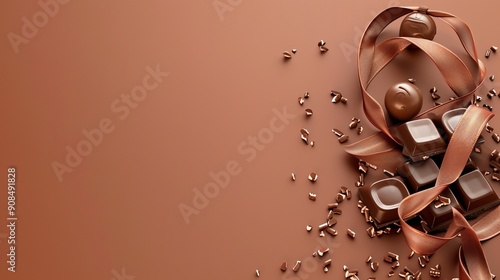 Fototapeta premium A chocolate bar with a brown ribbon tied around it, surrounded by chocolate...