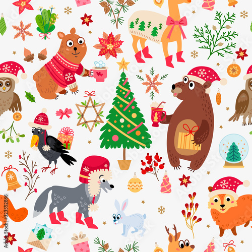 Naklejka premium A Christmas forest animals pattern. Winter vector