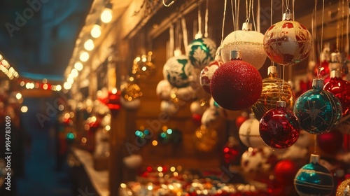 Naklejka premium A Christmas market stall selling handmade ornaments, with warm glowing lights...