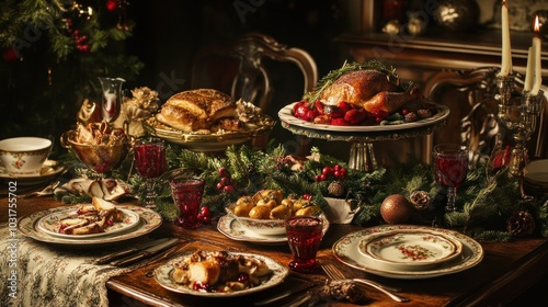 © Fana Art, Naklejka premium A Christmas table setting with a roasted turkey, baked bread, and fruit.
