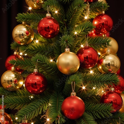© Pixel Matrix, Fototapeta premium A Christmas tree featuring multiple bright ornaments accompanied by a golden-and-red New Years tree arrangement