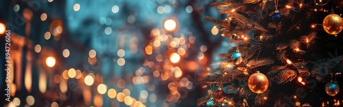 © BajimBa, Fototapeta premium A Christmas tree on the background of a Night city, a landscape with bright New Year's lights sparkling on buildings
