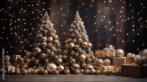© akhmad, Fototapeta premium A Christmas tree with many ornaments and a few gold boxes