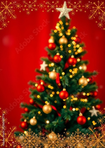 Fototapeta premium A christmas tree with shining ornaments and bokeh lights positioned against a red background with plenty of copy-space captured in hd qualityfestive christmas border with gold snowflakes and stars bok