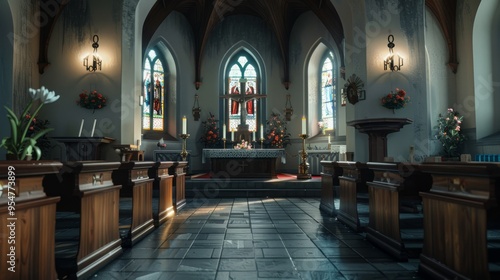 Fototapeta premium A church with stained glass windows and a cross