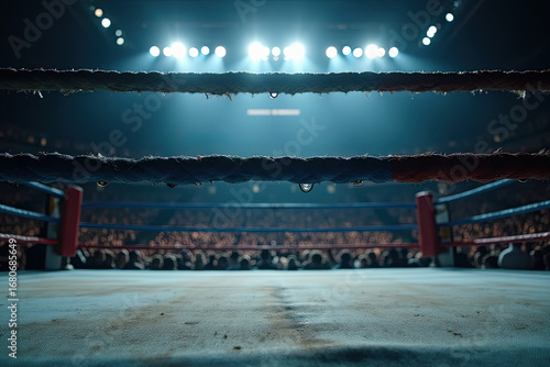 © Альона Федорова, Naklejka premium A cinematic close-up view of a professional boxing ring inside a massive sports arena, captured from ringside perspective. The ropes of the ring are in sharp focus, showing their worn texture and subt