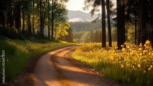 Obraz premium A cinematic photograph of a winding dirt road cutting through a dense forest, lined with vibrant yellow wildflowers.
