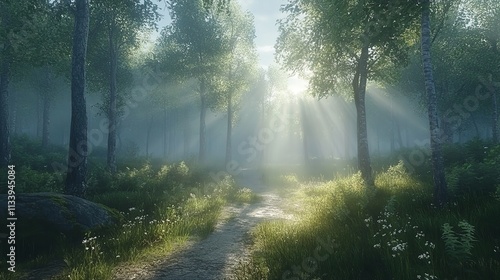 © alirazaartworks, Naklejka premium A cinematic shot of a misty forest at dawn, with sunlight filtering through the trees, creating a serene and mystical background.