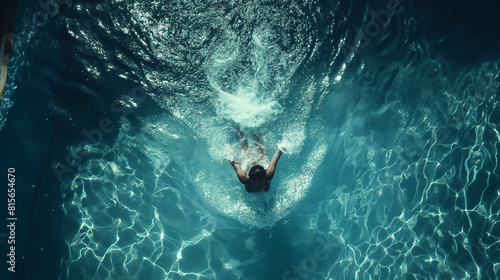 © Laura, Obraz premium A cinematic shot of a person plunging into a crystal-clear swimming pool, their body surrounded by pristine water as they dive deep beneath the surface, symbolizing the purity and