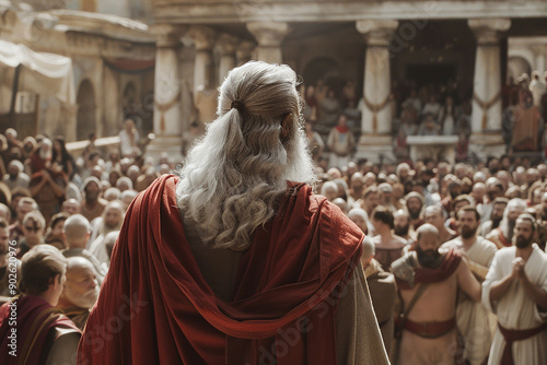 © Md Akter Hossen, Naklejka premium A cinematic shot of an ancient man with white hair and a beard wearing a red tunic standing in the middle