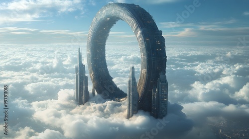 Fototapeta premium A circular city floating above the clouds, with spiral towers reaching toward the sky