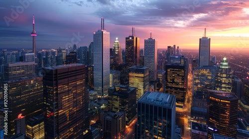 © peerawat, Fototapeta premium A city at dusk, with the sun setting behind a skyline of imposing skyscrapers.
