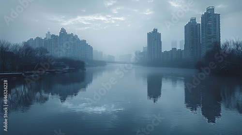 © visoot, Obraz premium A city behind the river, urban background, blue gray tone. Generative AI.