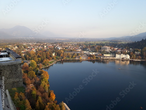 © 우리 배, Fototapeta premium A city in nature with mountains and lake.