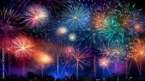 Fototapeta premium A city is lit up with fireworks and the sky is filled with bright colors.