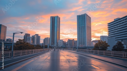 © pinporn manosri, Fototapeta premium A city skyline at dawn with soft, pastel hues in the sky, and a few early risers walking along the quiet streets.