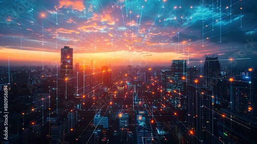 © kanesuan, Fototapeta premium A city skyline at dusk with illuminated buildings showcasing advanced urban data management systems