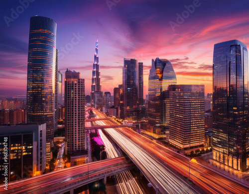 © dan, Fototapeta premium A city skyline at dusk, with modern skyscrapers lit up as the sun sets, casting a soft purpl