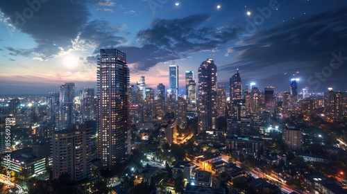 © Thanaporn, Fototapeta premium A city skyline at night with a bright moon in the sky