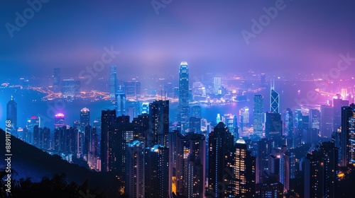 Fototapeta premium A city skyline at night with a purple hue. The city is lit up with lights and...